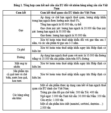 Đối với xuất khẩu của Việt Nam, ngay khi hiệp định có hiệu lực, EU sẽ xóa bỏ thuế nhập khẩu đối với khoảng 85,6% số dòng thuế, tương đương 70,3% kim ngạch xuất khẩu của Việt Nam sang EU. Sau 07 năm kể từ khi Hiệp định có hiệu lực, EU sẽ xóa bỏ thuế nhập khẩu đối với 99,2% số dòng thuế, tương đương 99,7% kim ngạch xuất khẩu của Việt Nam. Đối với khoảng 0,3% kim ngạch xuất khẩu còn lại, EU cam kết dành cho Việt Nam hạn ngạch thuế quan với thuế nhập khẩu trong hạn ngạch là 0%. Đối với hàng nông sản của Việt Nam, cam kết trong EVFTA dành nhiều ưu đãi cho nhiều nhóm hàng, phù hợp với những lợi thế của Việt Nam trong quan hệ với thị trường này (xem bảng 1).